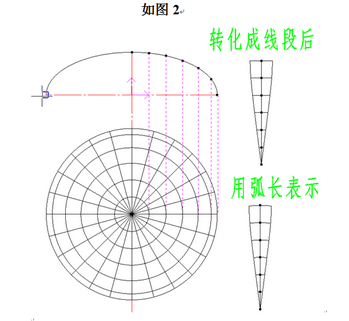 ⑸ 在所作的若干圓上截取相應的同心圓弧的長度,為了下料方便,把弧長轉化成線段的長度,按順序分別添加到素線的等分點上,如圖2。